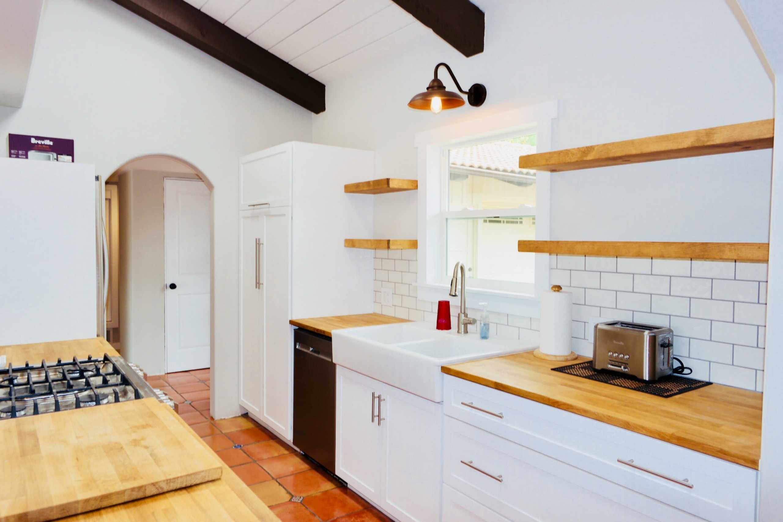Country meets spanish in this tastefully modernized, mid-century, adobe classic! Features large craftsman timber beam vaulted ceilings draped over fully refinished saltillo flooring. Lots of wonderful details including central heat and air-conditioning with wifi controlled thermostat, double-pane windows & patio sliders, tankless water heater, recessed lighting throughout, huge wood-burning fireplace, carpeted bedrooms & tiled bathrooms. Attached two-car garage with laundry zone featuring side-by-side washer & gas dryer as well as a custom workshop zone complete with benches, ample outlets & lighting. Large covered back patio features a custom rustic pallet wood bar buildout. Ample storage for RV or toys on side of garage.
